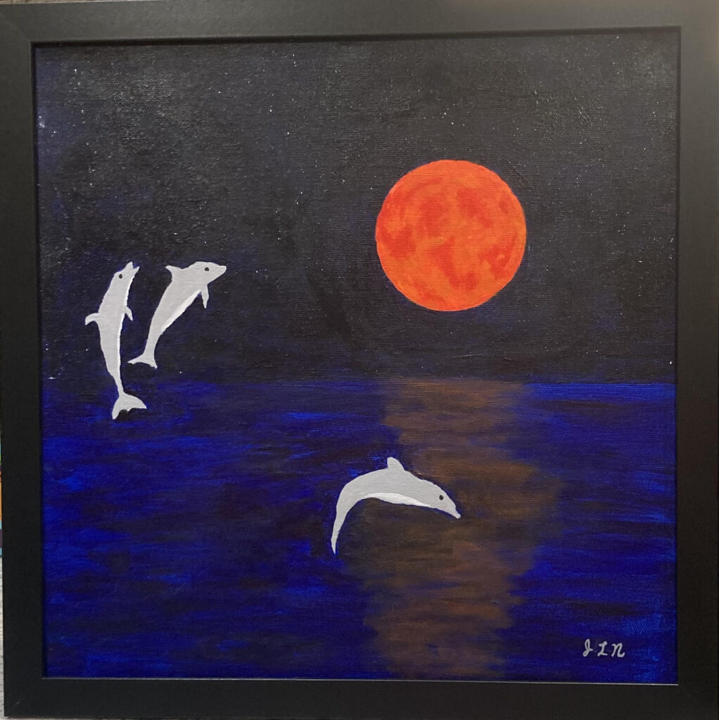 DANCING DOLPHINS 14X14 FRAMED – $90.00