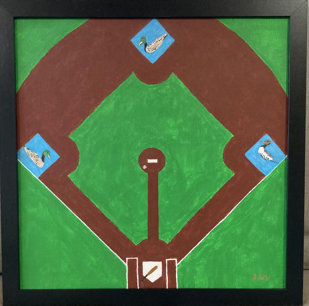 DUCKS ON THE POND 14X14 FRAMED – $90.00